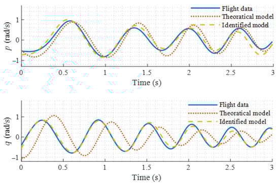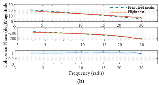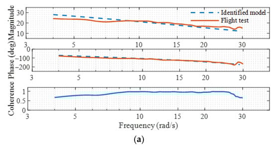 Frequency-domain system identifications are conducted based on Equation (3) using the recorded control input , and state output , . Frequency-domain identification results are shown in Figure 7. Figure 8 shows the comparison of the time-domain responses of the theoretical model, identified model, and flight data. It can be seen that the coherence of the identification results is close to 1. The frequency-domain responses of the identified model match the flight data with associated cost function values below 100 [31], which indicates that the simplified models have satisfactory fitness. From Figure 8, it can be seen that the time-domain response of the model after identification becomes closer to the flight data. The identified model parameters are listed in Table 2.