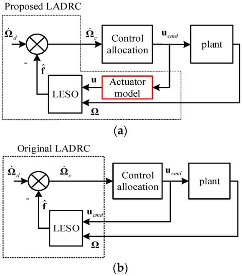 Proposed and original LADRC controller. (a) Actuator dynamics compensated LADRC attitude controller; (b) Original LADRC attitude controller.