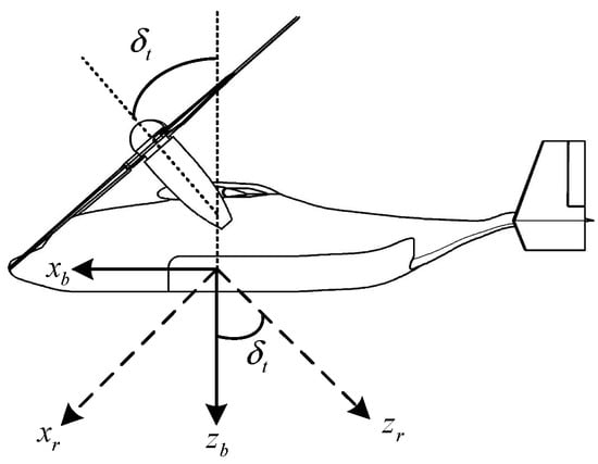 The rotor effectiveness matrix is resolved to the rotor mast axes [38] to simplify the calculation. The rotor mast axes are illustrated in Figure 11, where the subscript represents the body axes and the subscript represents the rotor mast axes. Its origin coincides with the body axes. It is obtained by rotating the body axes along its y-axis in its negative direction by .