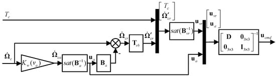 where is the desired angular acceleration vector from the outer loop controller, is the angular acceleration vector that the aircraft should generate, and represents the inverse of calculated by the control allocation algorithm introduced later.