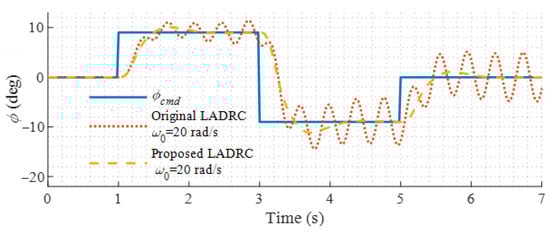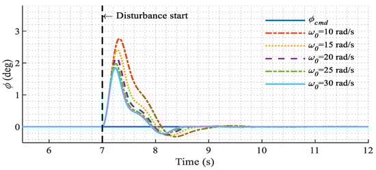 The robustness against external disturbances is also examined in the simulation. In the conversion mode where the tilt angle is 45°, a constant disturbance roll moment is applied to the model. The responses with different LESO bandwidth are compared in Figure 17. It is shown that, as increases, the settling time becomes shorter and the peak value becomes smaller. This result reveals one of the advantages of the proposed modified LADRC over the original one. That is, with the help of the compensated rotor dynamics, the bandwidth of the LESO is extended and higher robustness against disturbances is achieved.
