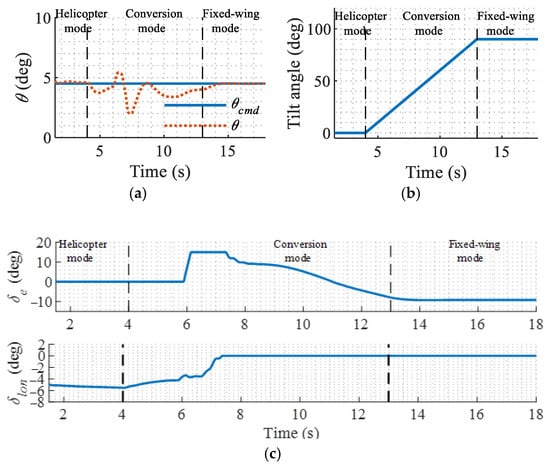 Conversion flight tests from the helicopter mode to the fixed-wing mode are conducted in the simulation using the proposed controller. The results are shown in Figure 14.