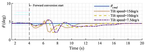 To better verify that the aircraft is stabilized when the tilt angle changes at different speeds, more conversion flight simulations are conducted with different tilt speeds. The pitch responses are shown in Figure 15. Overall, the pitch angle tracking error is within ±3° and the tilt speed has minor effects on the performance of the controller.