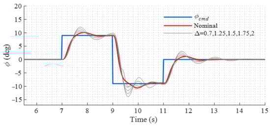 where is the control effectiveness of the model and is the perturbation coefficient. The roll responses to the doublet command in the conversion mode where the tilt angle is 45° are shown in Figure 16. It can be seen that the controller remains stable despite the fact that the model parameters vary over a relatively wide range.
