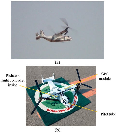The dual-tiltrotor UAV used in the flight tests is a modified RC model aircraft (a.k.a. Rotormast Scale RC VTOL), and it is shown in Figure 18. The original model aircraft only has collective and cyclic pitch controls and lacks aerodynamic control surfaces. Thus, the frame of the aircraft is modified and ailerons, elevator, rudders, and servos are added on the trailing edges of its wings and tails. The original flight controller is replaced by a Pixhawk flight controller and supplementary avionics like GPS and Pitot tube, as shown in Figure 18. The control laws are implemented into the flight controller, which runs PX4 open-source software. The aircraft parameters are listed in Table 5. The inertia tensor of the studied UAV is obtained via the trifilar pendulum approach [39].