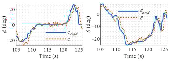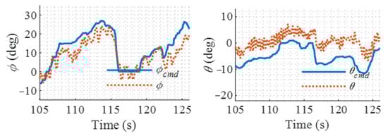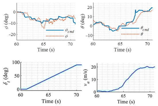 It can be seen from Figure 21 that, although the airspeed, the configuration of the aircraft, and available controls have dramatic changes in different flight modes, the controller keeps the aircraft stable with satisfactory attitude tracking performance. Another set of flight results are shown in Figure 22, which presents more clearly the responses during a continuous forward conversion flight from the helicopter mode to the fixed-wing mode. It is shown that the attitude tracks the command with a mean error of less than ±4° despite the chittering caused by the sensor measurement noise and mechanical jitter. With the help of the modification in LADRC, the relatively slow rotor flapping dynamics and servo dynamics are compensated; therefore, the severe oscillation of the original LADRC is avoided and the stability is guaranteed.