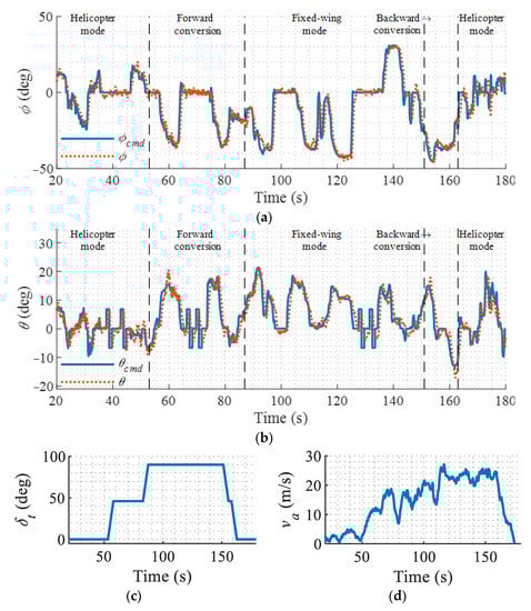 To examine the performance of the proposed controller in the entire flight envelope, a typical conversion flight is conducted. The aircraft takes off in the helicopter mode and converts to the fixed-wing mode, then converts back to the helicopter mode. The flight results of the entire process are shown in Figure 21.