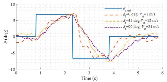To further evaluate the variation of controller performance in different flight modes, a standard doublet pitch angle command is given when the aircraft is in helicopter mode, conversion mode, and fixed-wing mode, respectively. The pitch angle responses in different flight modes are extracted and compared in Figure 23. It can be seen that the control rising time in different flight modes is all about 0.5 s, despite the variations in the airspeed, tilt angle, and control effectors in use. Slight differences occur when the pitch angle was restored to the neutral position. This may be because the damping effect of the wing and fuselage is different at different airspeeds.