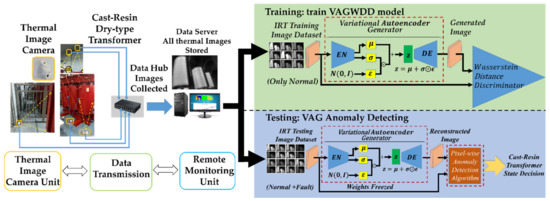 The proposed framework, as seen in Figure 1, is divided into three stages: image acquisition and dataset establishment, offline training model and online anomaly detecting. First, the IRT images for the normal and fault condition were captured by the proposed monitoring system. These images are collected into training and test data sets. Next is the offline training phase, which focuses on the adversarial training of the variational autoencoder generator (VAG) model. The VAG model is trained to generate images with normal states. Finally, in the test phase, the residual image is obtained by computing the absolute value of the pixel-wise cosine distance between the real image and the generated image, which directly shows the result after the inference analysis: normal or abnormal (and determine what kind of fault).