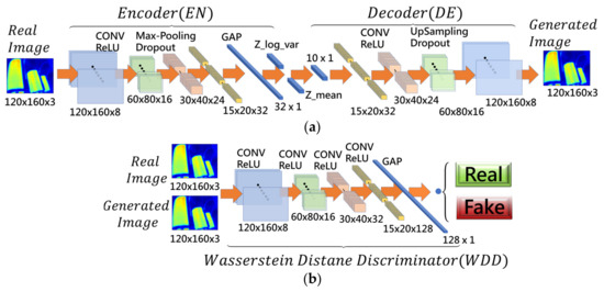 The generator loss function in Equation (16) proposed in this study refers to VAE [37] and GANomaly [30] architecture. The loss combination of image reconstruction and Kullback–Liebler divergence, called the, the WDD image feature loss and the Wasserstein loss are regarded as the loss function of the proposal with corresponding weights,, and .