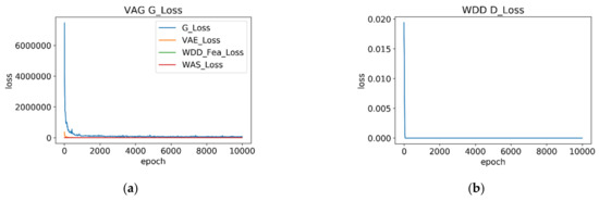 The training loss curve at every 20 epochs over 10,000 epochs of the VAG model with WDD. (a) the VAG G_loss curve; (b) the WDD D_Loss curve.