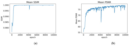 The curve of the VAG model training for every 20 epochs over 10,000 epochs. (a) Mean_SSIM; (b) Mean_PSNR.