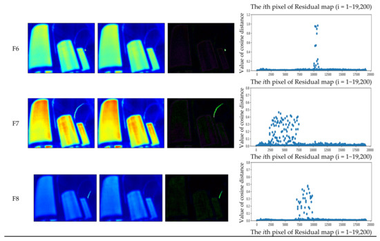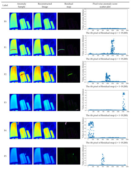 Figure 5 shows all kinds of anomaly samples, the reconstructed images generated by the proposed method after inputting the CT-IRT dataset, the residual map calculated by the difference between the anomaly samples and the reconstructed images and the pixel-wise anomaly score computed by cosine distance. It is worth noting that the proposed method can identify which sample is abnormal and which one is normal. In Figure 5, the pixel-level anomaly score scatter plot in the residual map can clearly show the location and number of pixels of the fault, which is very important for power transformer detection. By calculating the cosine distance for each pixel, we can get the result that the difference in value between the abnormal and normal pixel is at least 100 times more than the one between the normal and normal pixel, so it is not too difficult to identify the fault.