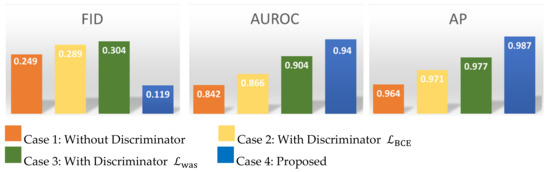 Here we demonstrate the utility of the additional components we used to stabilize the adversarial training VAGWDD model by systematically removing each component in turn. It is crucial for us to perform the ablation experiment to display the different combinations of loss functions on the CT-IRT datasets. All proposed loss functions we designed in this paper, shown in Figure 6, can effectively enhance the performance. Specifically, we verify four cases. In the first cases, we consider only , the variational autoencoder structure. In the second and third cases, we use variational autoencoder plus discriminators with the binary cross-entropy loss () and the Wasserstein distance loss (), respectively. In the final case, we consider the full proposed model, VAGWDD. AP and AUROC for 1022 testing images, including the normal and abnormal samples, are displayed in Figure 6. In addition, Fréchet Inception Distance (FID) is a very popular evaluation method for the GAN model recently [45]. We take FID score as the measurement for the difference between the input and reconstructed images.