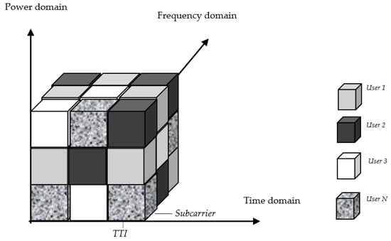The optimization problem is non-convex due to the coupled variables and in (20) and (21). To find a simplified solution, the proposed scheduler in this section exploits the convexity property of the sub-problems [27] for the main non-convex problem (17). In addition, the proposed algorithm makes use of the resource element structure in NOMA which takes one subcarrier in frequency and one time symbol known as transmission time interval (TTI) [28], as demonstrated in Figure 3. Hence, the proposed algorithm operates in two domains, as illustrated in Figure 4. The first is delay minimization to guarantee the delay requirement of each IoT device which is performed by a time domain packet scheduler (TDPS). The second domain is rate maximization to increase the spectral efficiency and maximize the system sum rate which is performed by a frequency domain packet scheduler (FDPS).