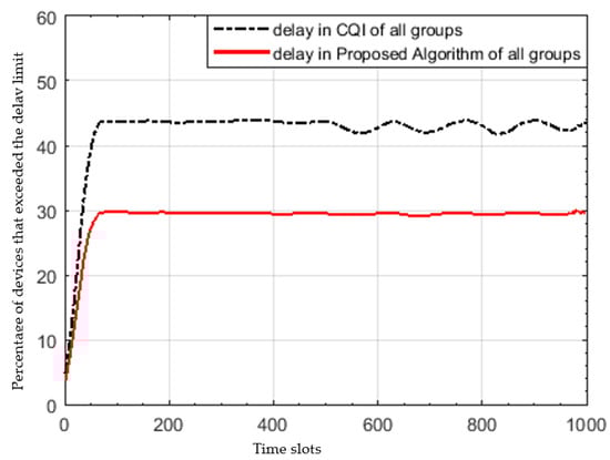 Figure 5 shows the percentage of IoT devices that exceeds the delay limit, and as clearly seen the proposed algorithm outperforms the maximum CQI and the gap increases with the time, until it reaches a certain point at which the percentage of devices exceeding the delay limit saturates in both algorithms. This is due to its receiving large requests and scheduling N_sel nodes only in each TTI while rejecting the rest of nodes. The percentage of devices exceeding the delay tolerance saturates in the proposed algorithm to nearly 30% but around 44% in maximum CQI. The proposed algorithm gives priority to the nodes of the maximum buffer and least delay tolerance, resulting in 31.8% delay improvement.