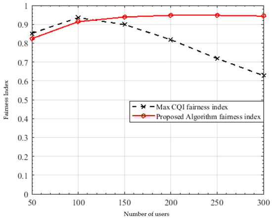 where represents the rate of user k and K is the total number of users. The fairness index values are confined between 0 and 1 such that the maximum value is achieved when the users have equal data rates. As obviously seen in Figure 6, the proposed algorithm is significantly fairer than the best CQI, since scheduling is performed sequentially from all groups, in addition to the fair power allocation algorithm used unlike the best CQI; resulting in 50.8% fairness enhancement at 300 users.