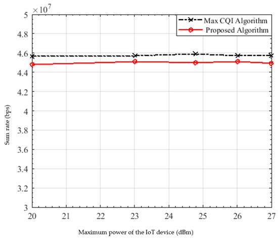 In Figure 7, the relationship between the transmitted power of the IoT devices and the sum rate is shown. As expected, the sum rate of the maximum CQI is greater than the proposed algorithm by only 1.6%; therefore, they still have a very close performance. By increasing the IoT device’s maximum power, the sum rate is nearly the same and does not change; this is due to the slight increase in the device’s maximum power that it does not affect the sum rate.