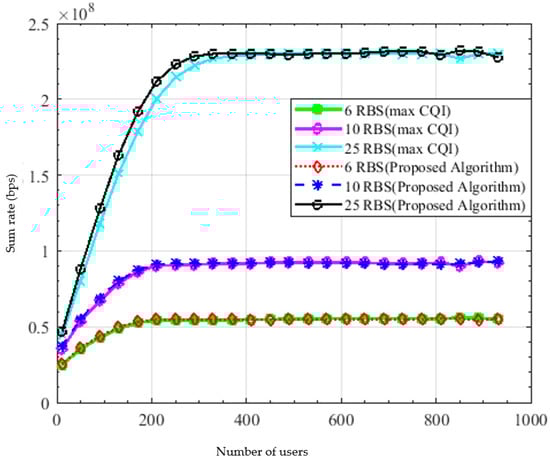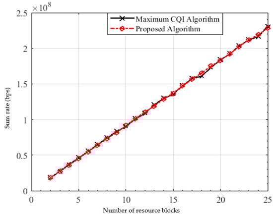Figure 9 shows the achieved sum rate versus the bandwidth (number of RBs) with maximum 2 users allocated to the resource block. The spectral efficiency of the proposed algorithm is almost closer to that of the maximum CQI, which verifies the efficiency of the proposed algorithm in terms of spectral efficiency.