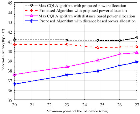Figure 10 shows the spectral efficiency versus the maximum power of the IoT devices comparing the performance of both the proposed resource allocation algorithm and the best CQI once using the proposed power allocation and once using distance-based power allocation. As can be clearly seen, the proposed power allocation outperforms the distance=based power allocation. Moreover, as expected, the maximum CQI is superior in terms of spectral efficiency which is on average 41.2 bps/Hz followed by the proposed algorithm which achieves very close performance, nearly 40.5 bps/Hz and about 1.69% decrease only.