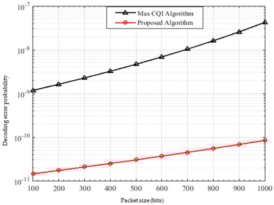 To evaluate the reliability of the algorithms, the relationship between the packet size and probability of decoding error is shown in Figure 11. As expected, as the packet size increases, the probability of error increases in both algorithms. However, the probability of error in the proposed algorithm is significantly lower than that of the max CQI, where at packet size = 1000 bits, is about and in the proposed algorithm and the max CQI respectively, resulting in nearly 99.7% performance improvement.