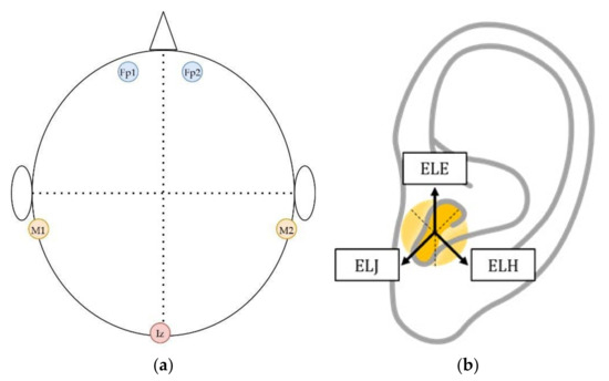 (a) Electrode placement on the head for EEG measurement according to 10–20 International electrode placement, Fp1 and Fp2 refer to forehead locations, M1 and M2 are mastoids and Iz is inion; (b) labeling scheme for the in-ear electrodes, Exy where x ∈ {L, R} refers to the left or right ear and y is the position of the electrodes.