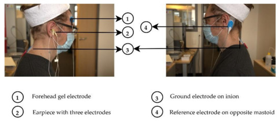 Other than the electrodes attached to the earpieces, all other electrodes utilized for measurements were conductive wet gel electrodes (Ambu® BlueSensor VL (Ballerup, Denmark) [27]. The impedance measurements were performed using a counter electrode at the inion, which is a protruding portion of the occipital bone at the base of the skull (as shown in Figure 3) and the Reference electrode was placed between the inion and the ear, such that it was equidistant from both. Figure 3 and Figure 4 illustrate the electrode placements on the participant under test. The ground electrode was placed at the inion, whilst the reference electrode was placed at the contralateral mastoid for EEG measurements.