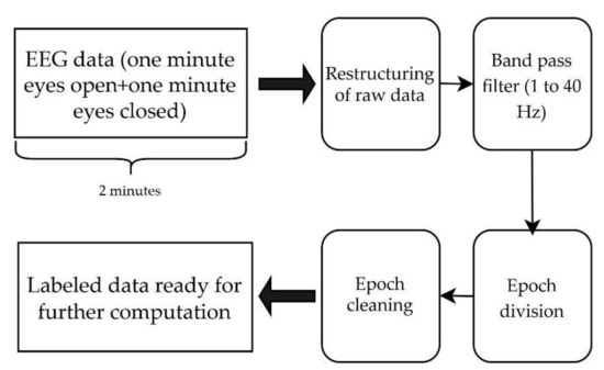 EEG data pre-processing pipeline. EEG data consisted of 2 min data of eyes-open and eyes-closed condition. The raw data were restructured with labels and then bandpass filtered, and split into epochs. Epochs were cleaned according to epoch acceptance criteria to have labeled data which were ready for further computations.