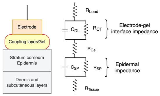 A simplified equivalent circuit model of the skin electrode interface is shown in Figure 7 [35]. It comprises the electrode lead resistance, RLead; the electrode-gel interface impedance (a parallel combination of the double-layer capacitance, CDL, and the charge transfer resistance, RCT); the gel resistance, RGel; the skin impedance (a parallel combination of a capacitance, CSP, and a resistance, RSP); and the underlying tissue resistance, RTissue. The equivalent circuit model shown here is a simplification of the complex electrical properties of the skin. The outermost skin layer, the stratum corneum, has a high resistance to current transmission. Consequently, the electrode impedance is dominated by the skin resistance. As a result, its dielectric properties and thin thickness, the stratum corneum allows capacitive coupling between a metal electrode placed on the skin’s surface and conductive tissues underneath it. The resistances of the lead, the gel, and the tissue, as well as of the electrode-gel contact is small in comparison to the skin. As a result, skin impedance typically predominates in dry electrode contacts.