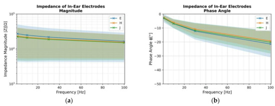 Mean impedance magnitude (a) and phase angle (b) with standard deviation of electrodes at in-ear locations E, J and H. n = 8.