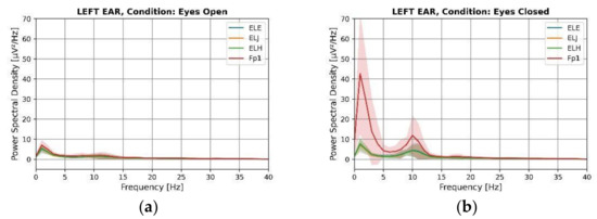 Power spectral density of electrodes for left ear measurements of eyes-open (a) and eyes-closed (b) conditions.
