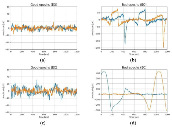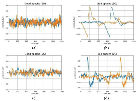 For eyes-open (EO) and the eyes-closed (EC) conditions, the epochs of the ear electrodes are shown. Two distinct epochs are indicated by two distinct colors, (a) good epochs for eyes-open, (b) bad epochs for eyes-open, (c) good epochs for eyes-closed, (d) bad epochs for eyes-closed.