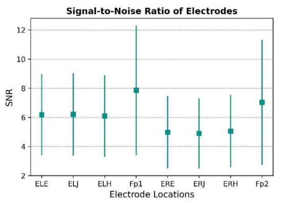 After pre-processing and removing bad epochs, the signal-to-noise ratio was calculated on the filtered data. The signal-to-noise ratio was averaged over all participants and trials. Figure 13 shows the mean and standard deviation of the SNR across each electrode to aid in describing the signal quality. The pre-processing pipeline removed the noise in the signal and improved the SNR. As a result, the values obtained at the frontal location, Fp1, with a mean of 8, and Fp2, with a mean of 7, are rather higher than the values obtained at the in-ear locations. The SNR values at the forehead are comparable to those reported in the literature at the scalp [33]. In-ear electrodes also exhibit a good SNR for EEG data recording, with the lowest value being 5 for the right ear, and the highest value being 6 for the left ear. Since wet gel electrodes cannot be placed in the ear, the SNR values for in-ear must be compared to the dry electrodes, and dry electrodes in the literature have an SNR ranging from 4.3 to 8.9 [33]. Although the SNR is lower for in-ear locations, the variance across individuals is also smaller. Typically, low impedance values signify a low signal to noise ratio; however, there was no correlation observed between the defined signal quality and the skin electrode contact impedance.