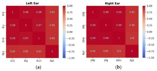Pearson correlation coefficient matrix of in-ear and forehead locations for left (a) and right ear (b).