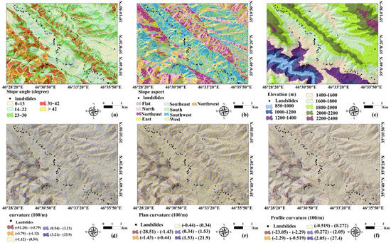 The selection of the factors affecting the occurrence of landslides is one of the most important steps in landslide susceptibility studies [46]. In this study, we selected 25 conditioning factors that were slope angle, aspect, elevation above sea level, curvature, profile curvature, plan curvature, solar radiation, valley depth (VD), terrain ruggedness index (TRI), vector ruggedness measure (VRM), stream power index (SPI), topographic wetness index (TWI), length slope (LS), topographic position index (TPI), land use, normalized difference vegetation index (NDVI), lithology, soil, distance to fault, distance to river, distance to road, fault density, river density, road density, and rainfall (Figure 2). We used some conditioning factors for this study area that were earlier published by Asadi et al. (2022).