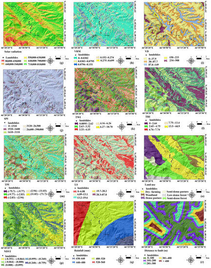 Land use is one of the important indicators in the instability of slopes, and it affects the characteristics of the land and changes its behavior [53]. In this study, the land use layer was prepared and extracted from an Iranian land use map. Land use/cover classes in the current research are dry-farming, semi-dense forest, low-dense forest, semi-dense pasture, dense pasture, and woodland (Figure 2o).