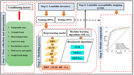 Figure 3 shows the workflow of our study. In step 1, we collect and interpret landslide-conditioning factors. In step 2, we divide landslide locations into the training and the validating datasets. In step 3, we conduct landslide modeling using the DL (deep learning) model and the three benchmark models (SVM, NBTree, and REPTree). In the DL model, we computed landslide susceptibility index (LSIs) for each pixel of the study in five steps: (i) constructing DBN using RBMs as pretraining on the dataset; (ii) parameter tuning in ELM to obtain the weights matrix from the last restricted Boltzmann machines (RBMs), (iii) fine tuning the training of the whole network by BP, (iv) optimizing the obtained weights from the network by the genetic algorithm (GA), and (v) assigning the optimum weights to the pixel of the study to map the landslide susceptibility. In step 4, we generate the landslide susceptibility maps using the outcomes of step 3. Finally, we compare and validate the performance of the models using a suite of statistical measures.