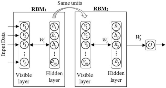 One of the most common deep neural networks (DBN) training techniques is the use of unsupervised pretraining, which initializes the network using only unlabeled data. Network initialization has been shown to be a good starting point for fine-tuning with the next observer, and greatly reduces the risk of being trapped at the local minimum according to Kustikova and Druzhkov [86]. One of the methods used to teach deep networking is the deep belief network. The deep belief network [87,88] has become a popular approach in machine learning due to its advantages such as fast inference and the ability to encode richer and higher-order network structures. DBN operates a hierarchical structure with several finite Boltzmann machines, and operates through a layered learning process [89]. A deep belief network with two Boltzmann machines bounded for one problem to n inputs and one output is shown in (Figure 4).