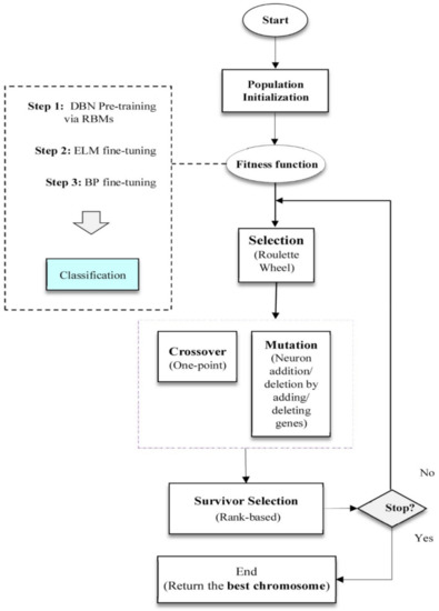In the proposed model, for network training, the deep belief network training process mentioned in the DBN section is used; the difference is that in the first fine-tuning step, the ELM is applied to teach the weights between the last hidden layer and the output layer (W3 in Figure 4). The optimal network structure is also derived from GA. The steps of the genetic algorithm are as follows: