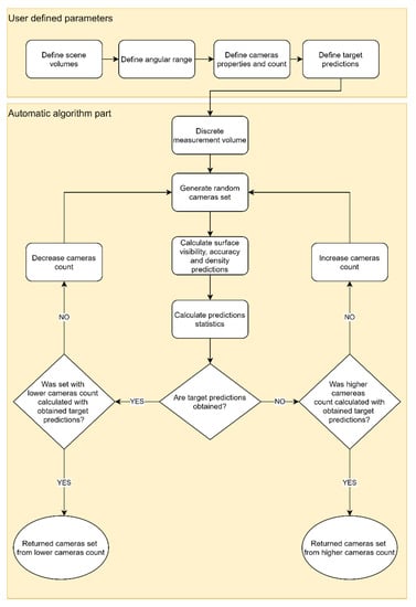 The proposed camera network design approach is based on the Monte Carlo algorithm [50]. It starts with setting the input parameters, namely the scene volumes, the parameters of the available cameras, and their number. Then, as presented in Figure 1, it consists of discretising the measurement volume and randomly generating multiple camera setups, calculating their predictions, and selecting the best one.