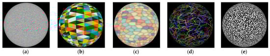 Example of the sphere with rendered texture used for final validation: (a) RGB noise (random colours), (b) colour triangles, (c) stained glass, (d) random colour line segments, and (e) random black points.