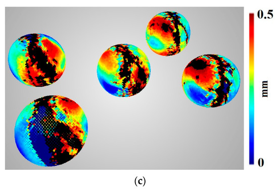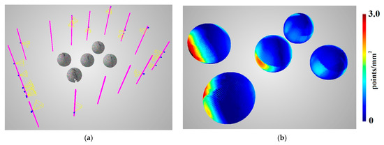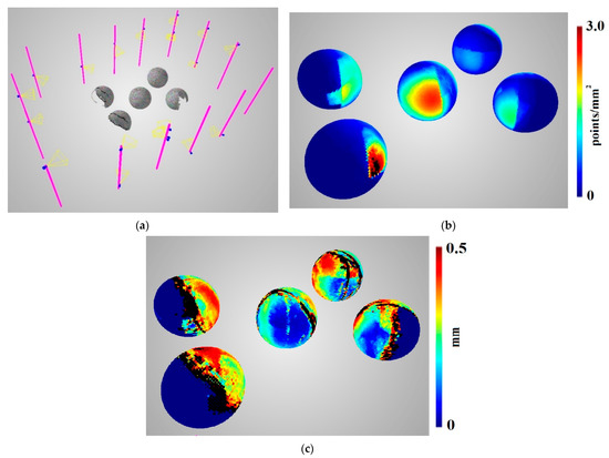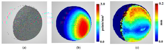 Example (a) sphere reconstruction from a two-camera scenario; (b) the results of density computation (points/mm2); (c) accuracy evaluation (mm).