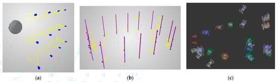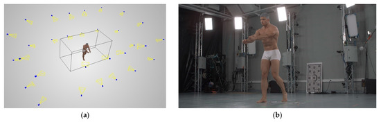 For the purposes of this paper, there were 10,000 random 360-degree scenes generated. Each of them consisted of a cuboid measurement volume of 2.6 × 4.0 × 2.0 m with columns around it, on which 20 cameras were mounted. The random camera positions were processed by drawing a single column for each camera, as well as the camera’s height on the column. Next, a random point from measurement volume was selected for the camera to look at. All cameras were rotated horizontally. The full description of the generation of random camera setups is described in Section 3.2.4, and an example camera setup is presented in Figure 4b,c.