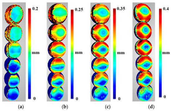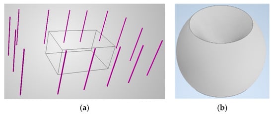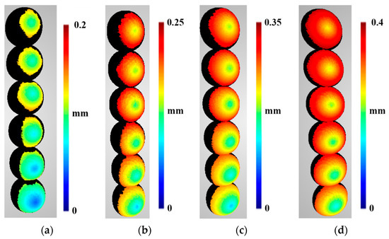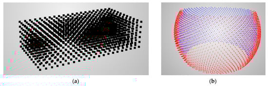 The first dataset consisted of setups with 2, 3, 4, 6, 9, or 12 cameras, respectively, placed on the XY plane at distances of 1 m in different configurations, with the sphere positioned at four distances on the Z-axis. In the two-, three-, and four-camera setups, the cameras were arranged in a single horizontal row; the six-, nine-, and twelve-camera setups were formed in 2 × 3, 3 × 3, and 4 × 3 camera arrays, respectively. For each scenario, the sphere was positioned at the following distances from the camera array plane: 2, 3, 4, and 5 m, in two variants each: on the cameras’ symmetry axis and off the symmetry axis. This resulted in 48 reconstructed spheres in total. As an example, the reconstructed sphere from the 12-camera scenario are presented in Figure 4a.