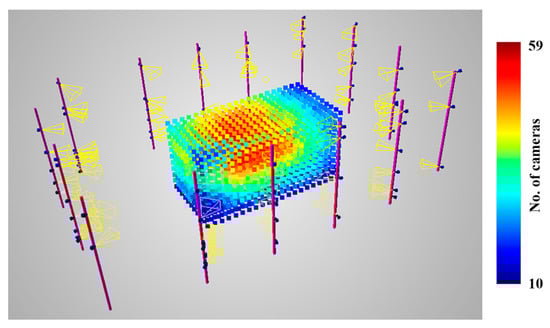 For points observed using three or fewer cameras, density prediction is calculated as the minimum of all active cameras. Otherwise, the average density of the top five cameras is considered to determine point density. The maximum number of cameras used for calculating the average value is taken from the OpenMVS number–views parameter (the number of views used for depth map estimation), which was set to 5. Thus, the predicted density D was calculated using the following formula: