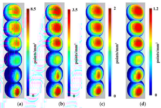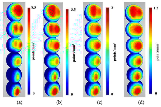 Analysing the results obtained for density of points per mm2, the asymmetry of the distribution can be observed. This is due to the algorithm used to detect mismatched characteristic areas on stereo pairs (Patch-Based Stereo Method; Normalized Cross-Correlation) and the Depth-Map Refinement and Merging method adopted (Figure 10). The proposed algorithm cannot be used explicitly with the Semi-Global Matching algorithm, which is implemented, e.g., in the commercial software Agisoft Metashape, because when comparing the density results obtained for six cameras, a significant difference in the distribution of points can be observed (Figure 21).