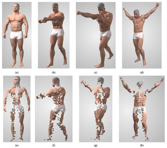 Analysing the densities of the 3D reconstructions of the four poses presented in Figure 20, it can be observed that the lowest densities were located in the upper parts of the body with normal vectors directed upwards, and in the lower parts of the body. This is because the cameras were placed around the scene, with no cameras observing the subject from the bottom or from the top. The highest densities were obtained in the middle of the 3D model.