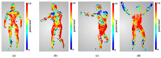 Sparse point clouds of the subject in different poses: (a) pose 1, (b) pose 2, (c) pose 3, (d) pose 4, with density evaluations presented as colormaps.
