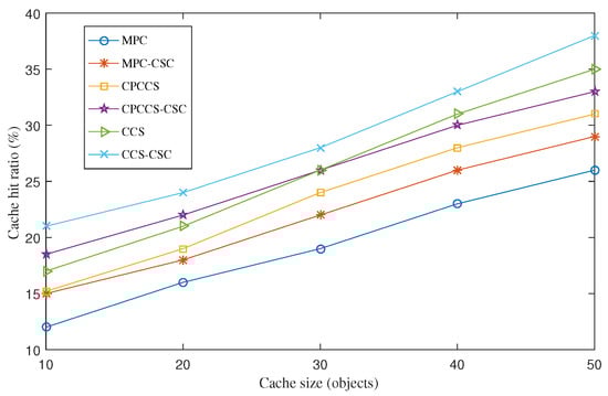 Average cache hit ratio of MPC, MPC-CSC, CPCCS, CPCCS-CSC, CCS, and CCS-CSC under various cache sizes.