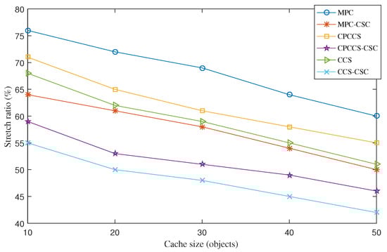 Average stretch ratio of MPC, MPC-CSC, CPCCS, CPCCS-CSC, CCS, and CCS-CSC under various cache sizes.